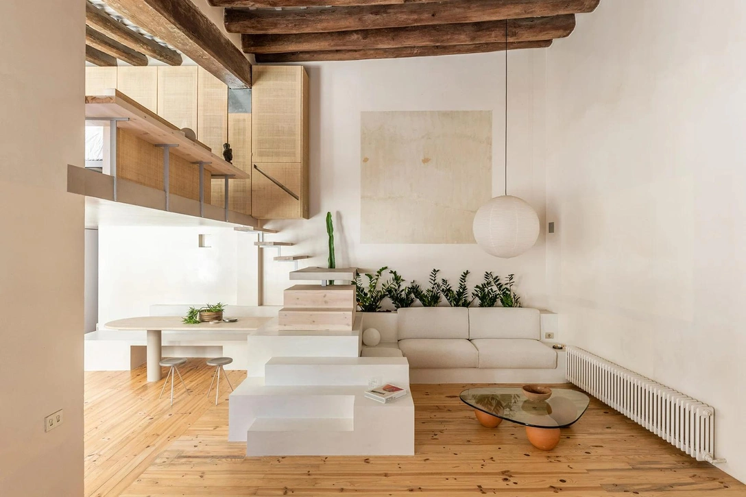 Владелец этой квартиры в Барселоне, молодой итальянский модельер, попросил Маттео Коломбо (Matteo Colombo) и Андреа Серболи (Andrea Serboli) лишь обновить санузел и добавить места для хранения. Но дизанеры предложили более масштабную реконструкцию, которая полностью задействовала бы высоту потолков и отражала в интерьере элементы ваби-саби — японской философии, которая воспевает красоту несовершенства и изменений, происходящих с течением времени.