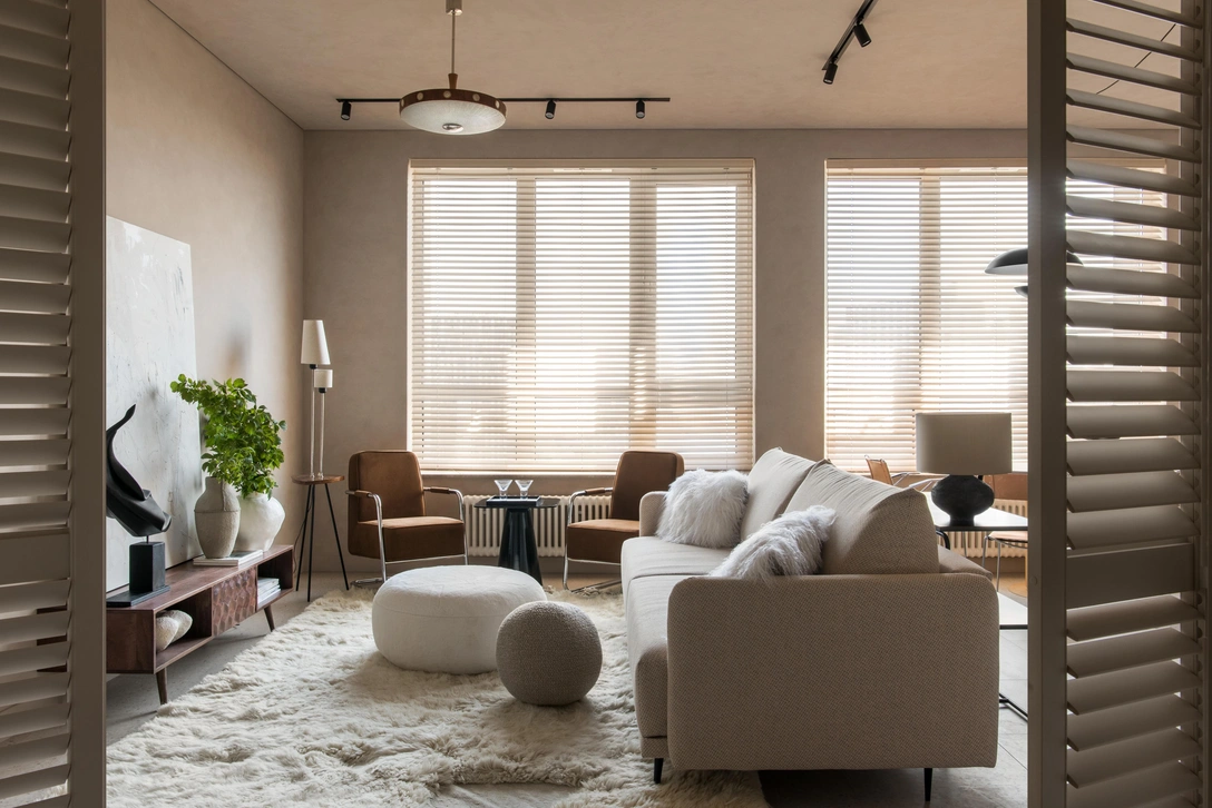 Основная идея проекта: создать актуальный интерьер в нюдовой цветовой гамме, но сделать его не нежным пастельным, а, напротив, грубым и самобытным