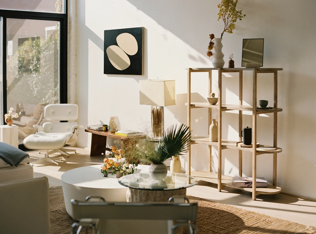 Весь интерьер выполнен в светлых тонах, которые сочетаются с выразительными текстурами натуральных материалов: березовой фанеры, ротанга, джута и льна. Архитектурные элементы, напоминающие об индустриальном прошлом здания, такие как большое вентиляционное отверстие над антресолью, были сохранены, но закрашены.
