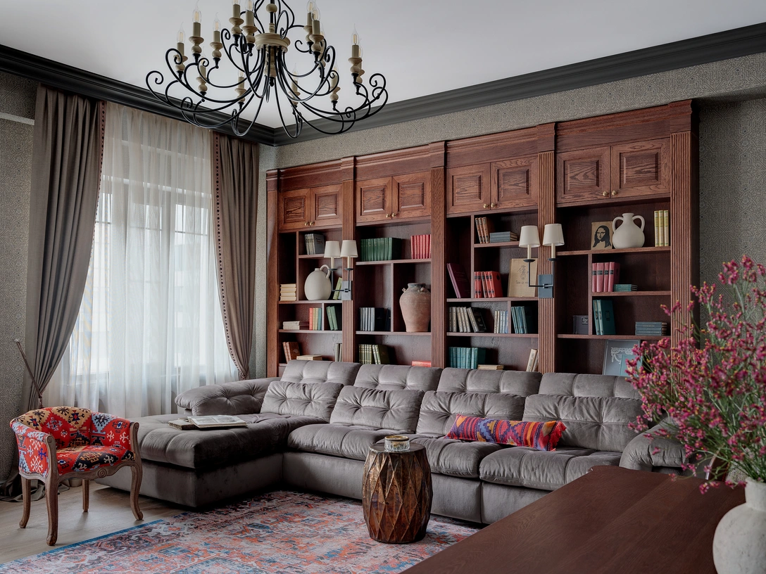 «Хозяева квартиры — ценители всего массивного, резного, фактурного и атмосферного. Отделочные материалы выбирались согласно критериям „красивая фактура“, „сложный цвет“ или „тонкий орнамент“. Им не нравятся предметы из масс-маркета, поэтому почти вся мебель сделана на заказ на местном столярном производстве Bronze Home».
