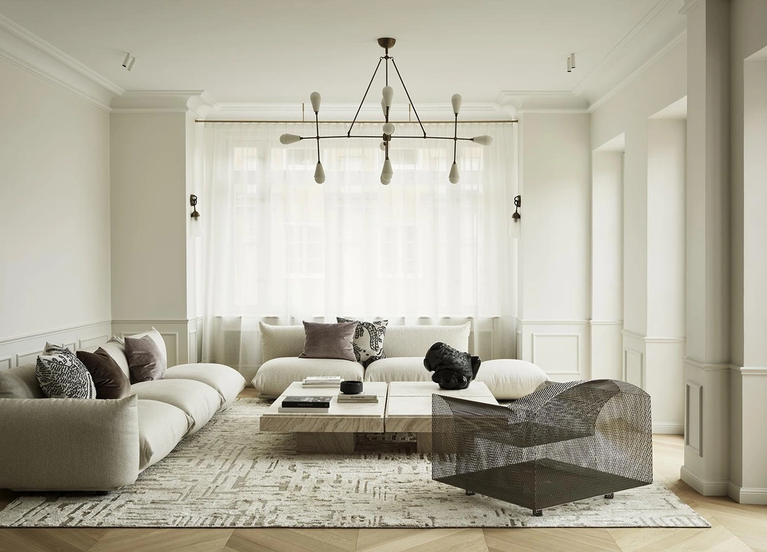 Планировку квартиры, сохранившуюся с 1920-х годов, дизайнеры оставили без изменений. При этом полы, отделку стен и существующие столярные изделия обновили, придав пространству более современный вид. Интерьер выдержан в светлых тонах, благодаря которым и без того просторные комнаты с высокими потолками кажутся еще больше.
