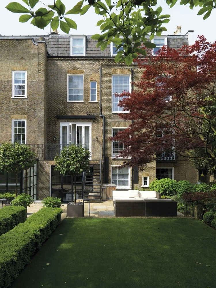 Кирпичный фасад лондонской резиденции возвращает нас в прошлое, к классическому георгианскому стилю. Экстерьер дома и прилежащих построек остался почти нетронутым: только бассейн напоминает нам о том, что сейчас не далеко не 18 век. Но внутри дом наполнен цветом и больше похож на отпускное жилье где-нибудь на побережье Средиземного моря.