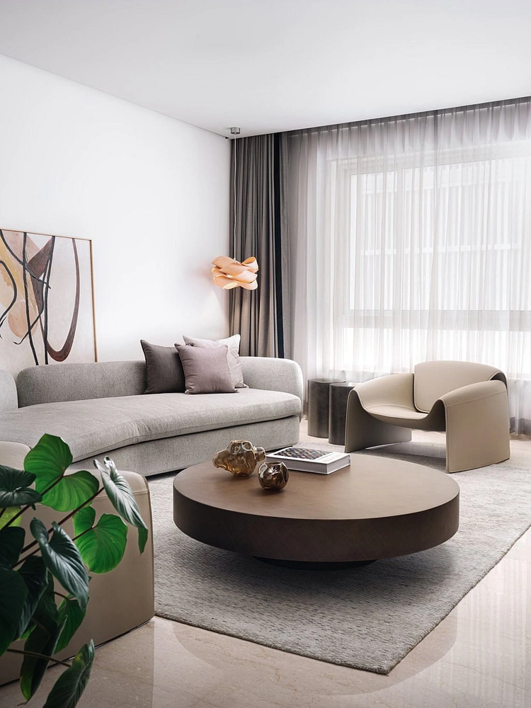 «Отправной точкой стал цвет. Мы остановились на монохромной гамме с редкими яркими акцентами, сосредоточившись на материалах и фактурах. Каждый предмет мебели, освещения, искусства и декора тщательно подбирался, здесь нет случайных вещей», — говорит дизайн-дуэт. Натуральная кожа, светлый шпон, мягкие ткани — все подчинено идее современной роскоши. И, конечно, важную роль играет естественный свет, который всегда заливает пространства благодаря расположению квартиры на последнем этаже.