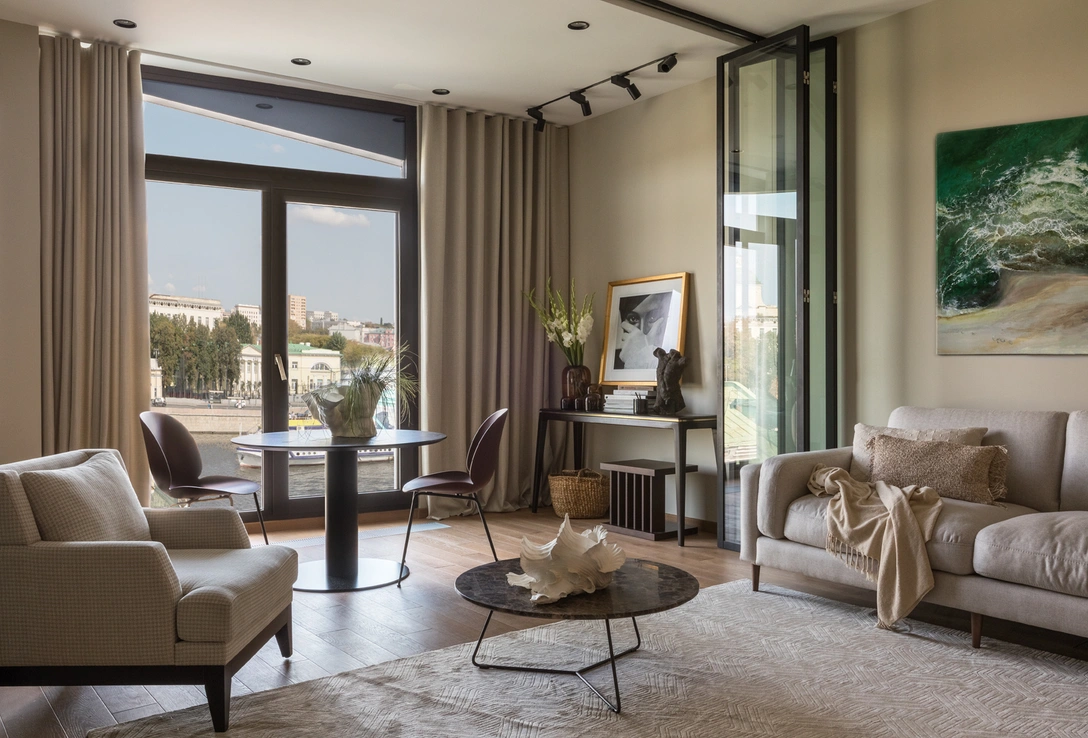 Цветовая гамма: теплые оттенки травертина и капучино, активный цвет присутствует только в текстиле и в арт-объектах, которые при желании легко заменить