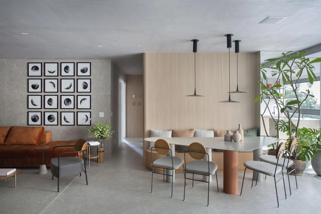 Владельцы этой квартиры площадью 145 кв. метров в бразильском муниципалитете Нитерое — пара среднего возраста с двумя детьми (подростком и младенцем). Едва получив ключи от застройщика, они сразу же обратились к архитекторам Каде Марино (Cadé Marino), Мишель Уилкинсон (Michelle Wilkinson) и Тьяго Морше (Thiago Morsch) из бюро Up3 Arquitetura Office, чтобы те превратили бетонную коробку в дом мечты. Хозяевам требовалось просторное и светлое помещение, где можно было бы принимать друзей, устраивать вечеринки для родственников и с комфортом жить большой семье. «Кроме того, они хотели, чтобы пространство было одновременно легким и изысканным, с присутствием цвета только в деталях», — вспоминают архитекторы. Еще одним требованием было объединить кухню с гостиной.