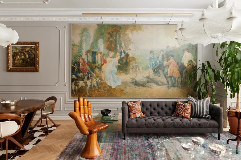 «Самым сложным моментом было перемещение этой монументальной работы в основную гостиную. Полотно нужно было очень осторожно поднимать через отверстие на лестничной клетке», — вспоминает архитектор. К счастью, картина попала в дом без повреждений и теперь занимает почетное место на стене гостиной — комнате, которая, по словам архитекторов, стала любимой комнатой владельцев.
