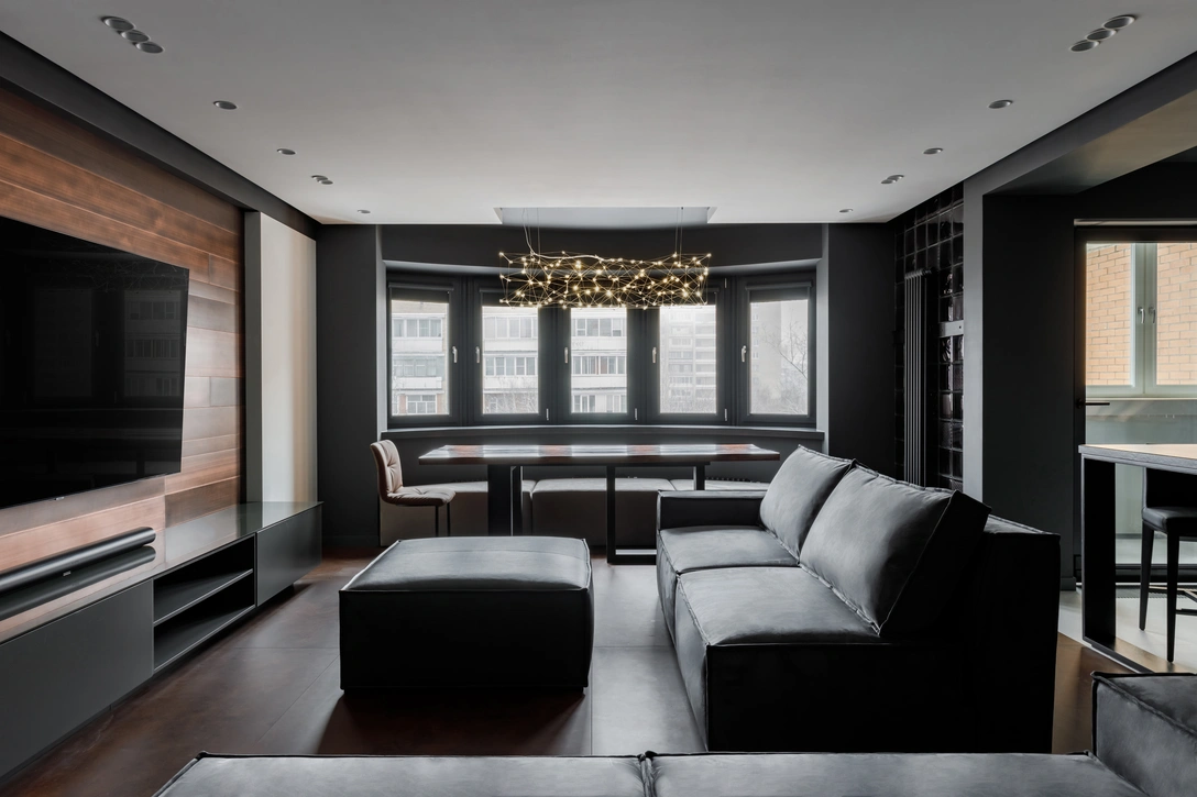 «Монолитные стены не позволили сделать перепланировку, так что основные помещения остались на своих местах. Чтобы гармонизировать пространство мы использовали максимально высокие, до несущих балок, сдвижные перегородки для выходов на лоджии. При этом использовали графитовый цвет для рам окон и дверей и примыкающих стен, зрительно увеличивая относительно небольшие окна. А лоджии, наоборот, сделали белыми, для того, чтобы они растворялись в солнечном свете. Большое количество балок в гостиной соединили со стенами одним цветом, делая их частью высоких проемов. В очень маленький и узкий коридор спальной зоны добавили матовый стеклянный фрагмент с подсветкой, имитируя окно в пол. Невысокие проемы в монолитных стенах визуально скрыли стеновыми панелями в цвет дверных полотен. В закругленном эркере установили пуфы единым блоком, выравнивая геометрию гостиной. Такими способами мы максимально приблизили угловатую квартиру к современным планировочным решениям».