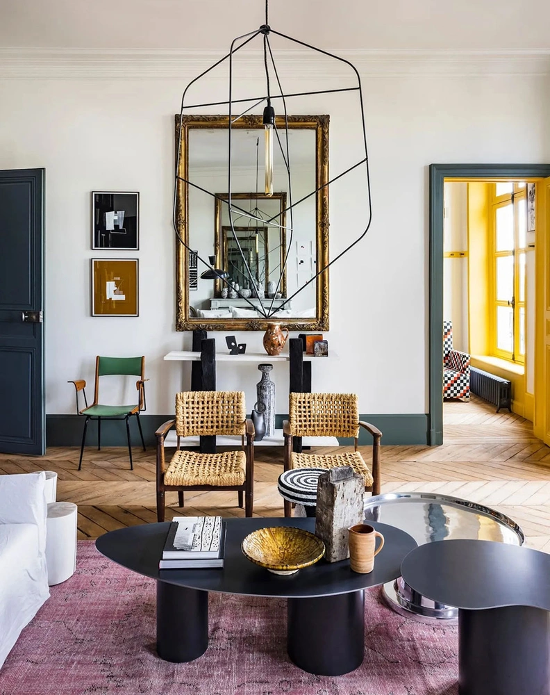 Первым делом Дешамп провел полную перепланировку 120-метровой квартиры. Теперь вход располагается на кухне. Для работы над интерьером команда Merci пригласила сразу несколько художников и ремесленников. Парижский керамист украсил пол кухни ассиметричной плиткой, а художница Софи Глассер (Sophie Glasser) дополнила лепнину в густавском стиле необычными узорами.