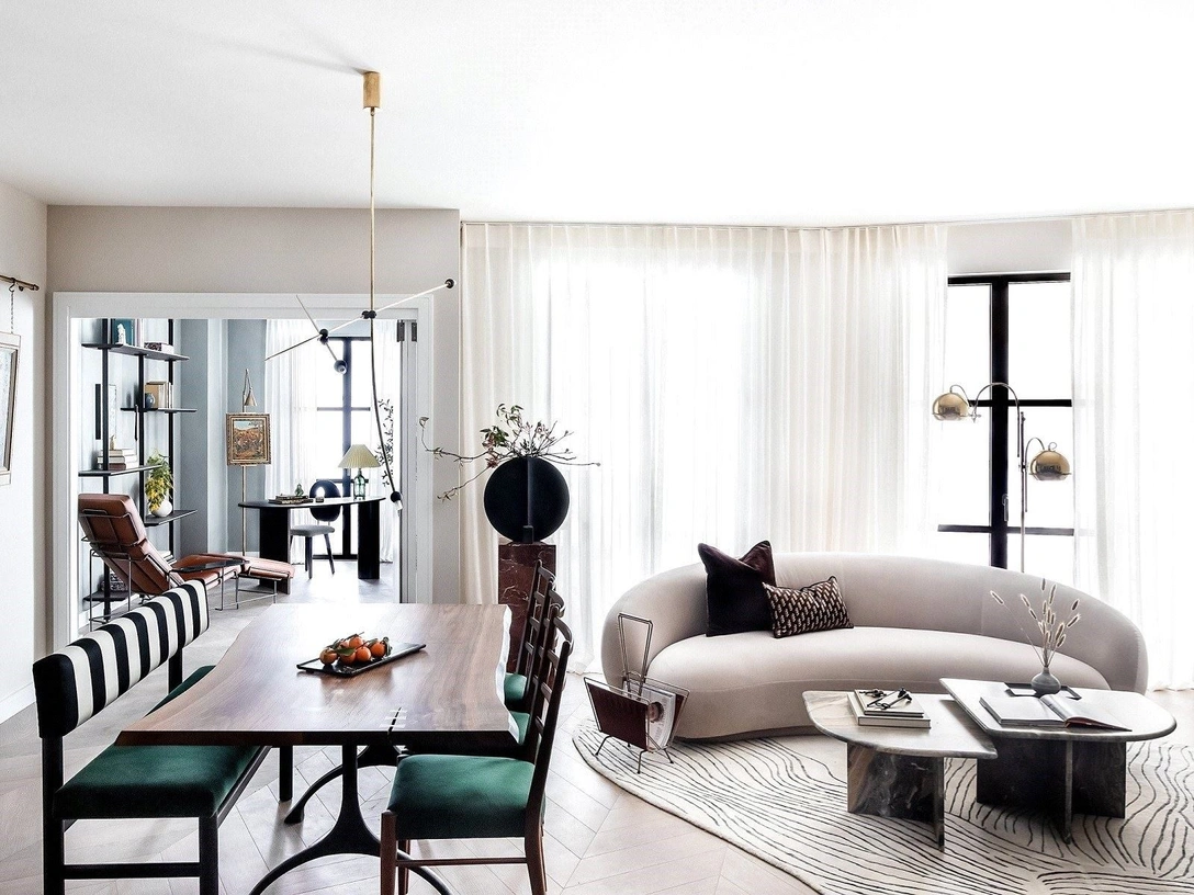Ремесленные традиции и история района стали главными источниками вдохновения для студии Bergman & Mar. Квартира с тремя спальнями и домашним офисом выполнена в сдержанной мужском стиле и наполнена 15 предметами мебели, выполненными на заказ, и множеством картин эпохи модернизма. Центром просторной гостиной стал изогнутый диван от Tacchini, дополненный каменными журнальными столиками и винтажным креслом, обитым тканью в клетку. Со светлой гаммой гостиной контрастирует черная кухня со стеклянными тонированными фасадами.