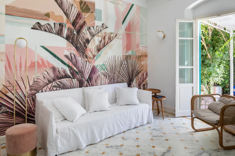 Команда сохранила часть оригинальных элементов, таких как арочные окна и дверные проемы, но при этом избавилась от существующих перегородок, чтобы создать общее обеденное пространство. Залитую светом гостиную украшает диван Ghost от Gervasoni, плетеные кресла и яркие обои от Wall & Deco.