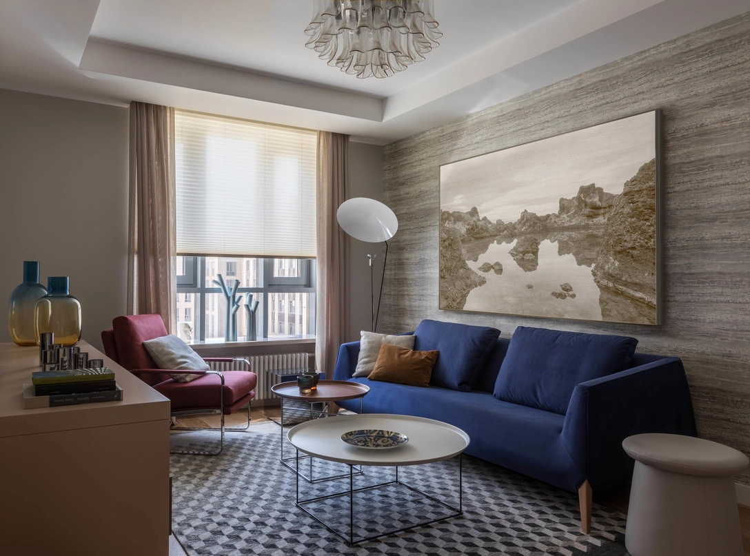 Цветовая гамма: нейтральные цвета с синими и терракотовыми акцентами