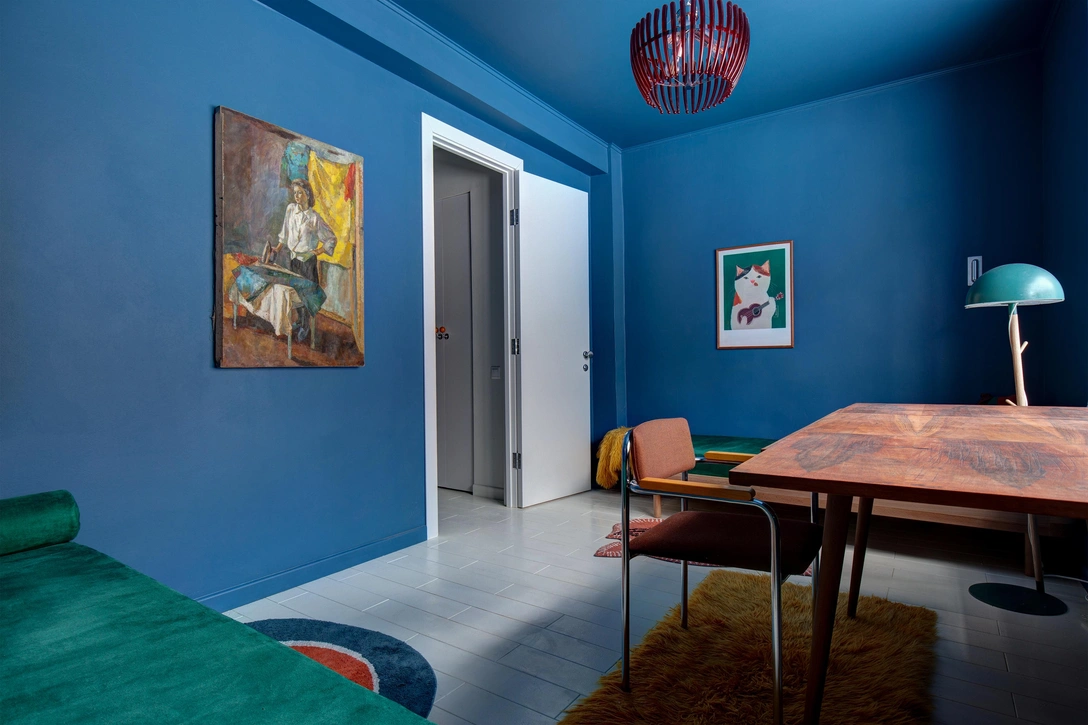 Ритм всему интерьеру задала репродукция картины авангардистки Сони Делоне «Электрические призмы». Элементы этой работы, написанной в 1914 году, нашли отражение в цвете помещений и геометрических формах, ярких акцентах светильников и декоративных предметов.