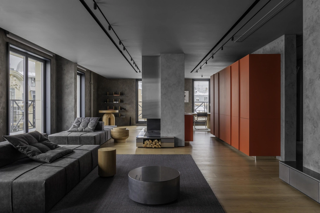 «Мы сделали уникальную трансформируемую планировку: две трети квартиры занимает общественная зона — огромное открытое цельное пространство с камином в центре. Это пространство включает в себя: прихожую, гостиную, кухню, столовую, кабинет, диджейский пульт. При необходимости — все эти зоны можно отделить друг от друга с помощью перегородок, — рассказывают дизайнеры. — Таким образом, здесь можно и работать, и устраивать вечеринки, и проводить камерные семейные ужины».