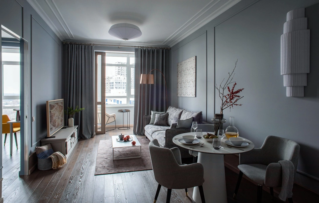 Цветовая гамма: холодная серо-голубая палитра с теплыми акцентами