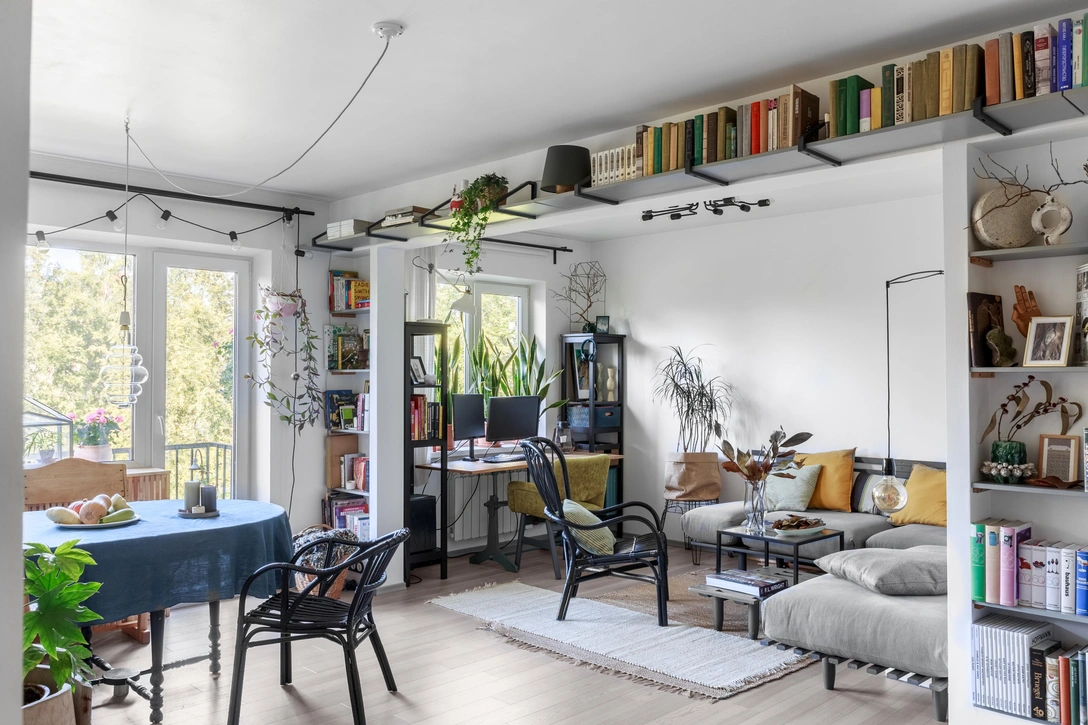 Чтобы увеличить площадь общей зоны, дизайнер убрала все перегородки: пространство зонируют несущие колонны и балки. На одной из балок разместилась основная часть библиотеки. Основные системы хранения встроены, что позволило освободить максимум места. «Это живой интерьер, в нем периодически что-то меняется, предметы мебели и декора собирались и собираются по барахолкам и винтажным маркетам разных стран. Что-то остается, а что-то уезжает в другие проекты», — добавляет Анна.