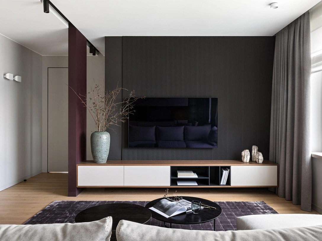 Главной задачей дизайнеров было создать в интерьере ощущение тепла и уюта, поэтому в качестве основы цветовой гаммы они выбрали светлые тона с добавлением медового оттенка дерева, а в качестве акцента — насыщенный темно-сливовый цвет, из-за которого, кстати, авторы назвали этот проект Cappuccino plum. «Название появилось во время разработки графической концепции. Довольно яркий оттенок спелых слив в интерьере не может не притягивать внимание. Цвет мягкий и нежный, сочный и зрелый, теплый и „вкусный“. Он привлекает внимание в гостиной и переходит в спальню, окутывая пространство уютом и создавая целостный образ».
