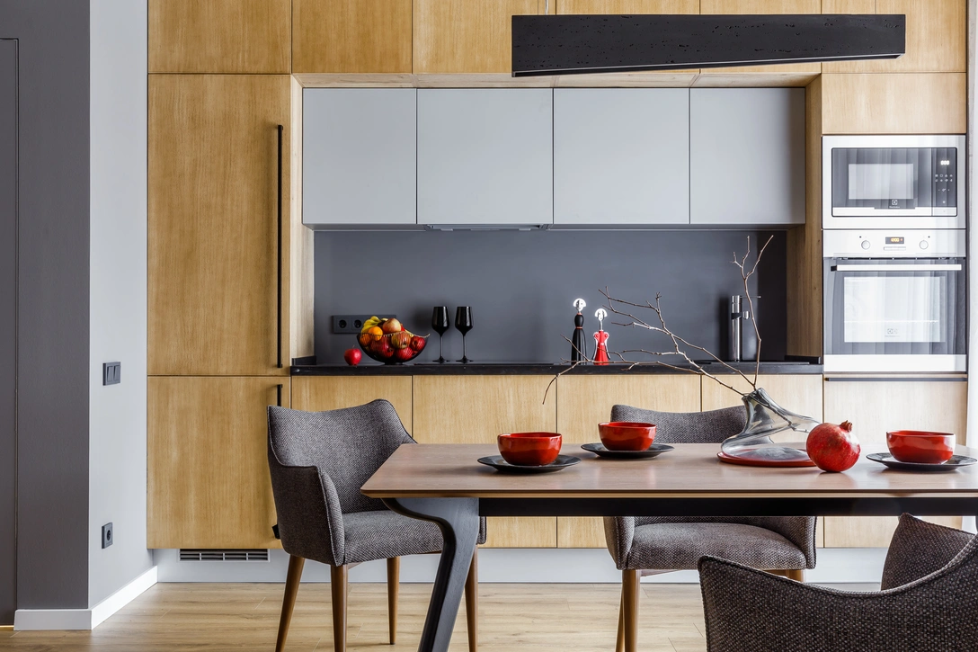 «Нейтральную гамму разбавляет яркий текстиль и керамика. На кроватях расположились подушки и пледы в бордовом, оранжевом, изумрудно-зеленом цветах. Интерьер кухни-гостиной дополняет красный сервиз и очаровательные перечница и солонка в виде человечков. Акцентной деталью всей квартиры стало желтое кресло, которое контрастирует с природными оттенками отделки».