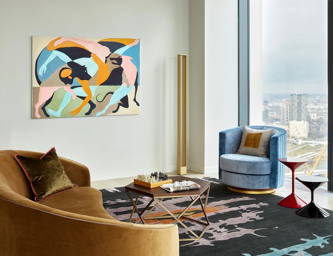 Квартира принадлежит интеллигентной, интересующейся искусством супружеской паре, которая много путешествует по миру и редко бывает в Москве. Задачей было создать интерьер для временного и комфортного проживания, смягчить холодную атмосферу делового центра Москва-Сити, придать объекту жилой, уютный вид.