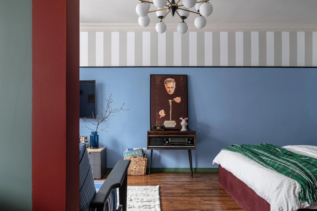 «Заказчица просила интерьер в стиле „Красная Москва“, — вспоминает Анна, — у меня это словосочетание ассоциировалось с цветами из русской росписи: красный, как рябина, голубой, как гжель, зеленый, как листья. Вообще, я очень рада, что для посуточной аренды получилось сделать такую цветную квартиру. В большинстве случаев квартиры для сдачи светлые, скандинавские, а у нас — особенная».