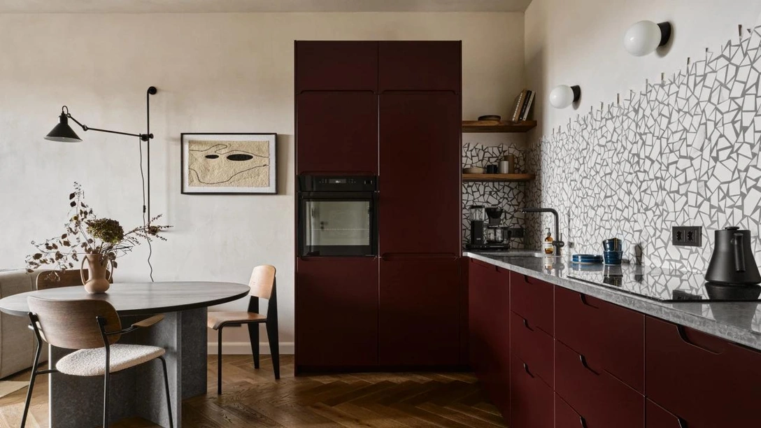 По роду своей профессии Ева — человек решительный и хладнокровный, поэтому и к дизайну своей квартиры она подошла решительно, первым делом сломав стену между кухней и прихожей, что сразу сделало помещение просторнее. А Милена предложила идею бордовой кухни без верхних полок, что сразу пришлось по душе хозяйке дома. В результате именно кухня стала одним из самых ярких и эффектных мест в доме.