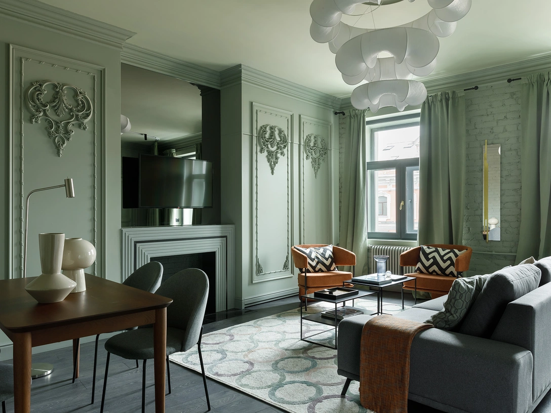 «Одну из главных ролей в интерьере играет цвет. Чтобы создать эффект обволакивающего пространства, мы выбрали для стен и потолка два оттенка зеленого, которые отличаются всего на пару тонов. Зеленая гамма разбавлена редкими вкраплениями терракоты и графита, которые создают визуальную связь с видом из окон. Грязно-розовый цвет фасадов домов плавно перетекает на кресла, узоры на ковре и винтажный комод».