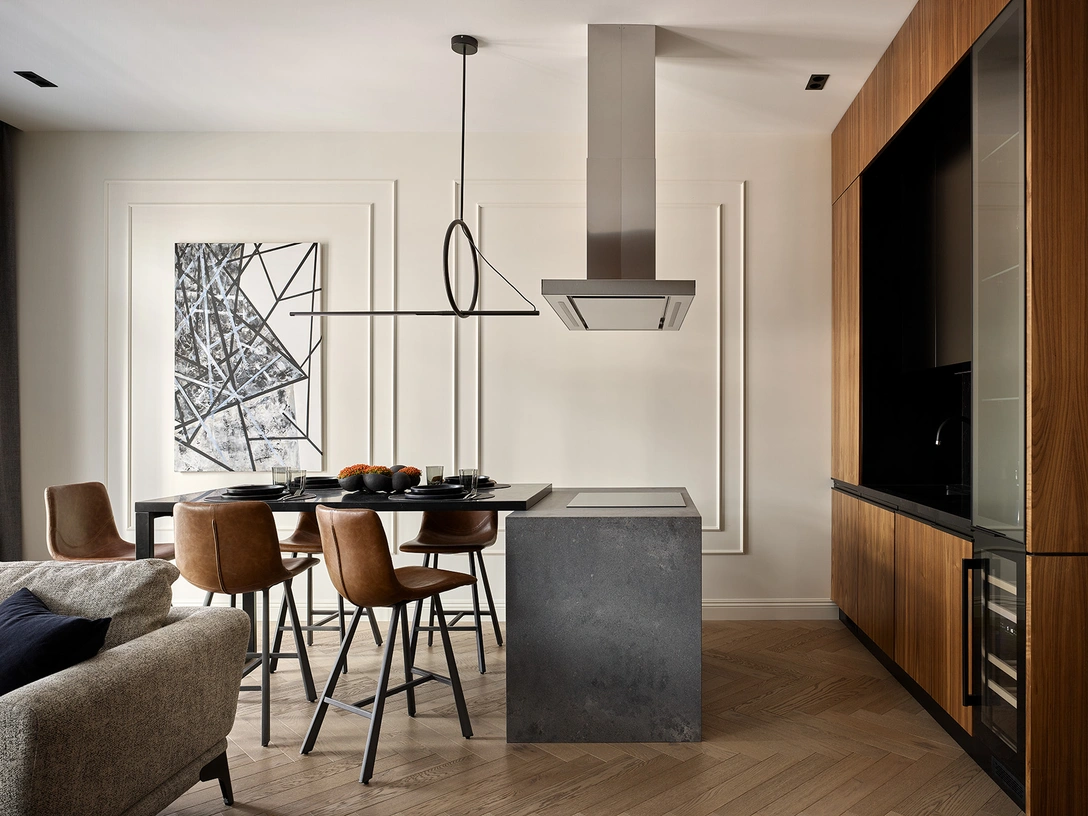 «Заказчики были готовы на смелые решения. Они хотели, чтобы квартира напоминала номер в роскошном отеле, — рассказывает дизайнер Лилия Линник. — Мы предложили использовать в качестве основных отделочных материалов дерево и камень разных оттенков. Так появилась стена в керамограните со скрытой дверью в спальню и кухня с деревянными фасадами и подсвеченной витриной для бокалов».