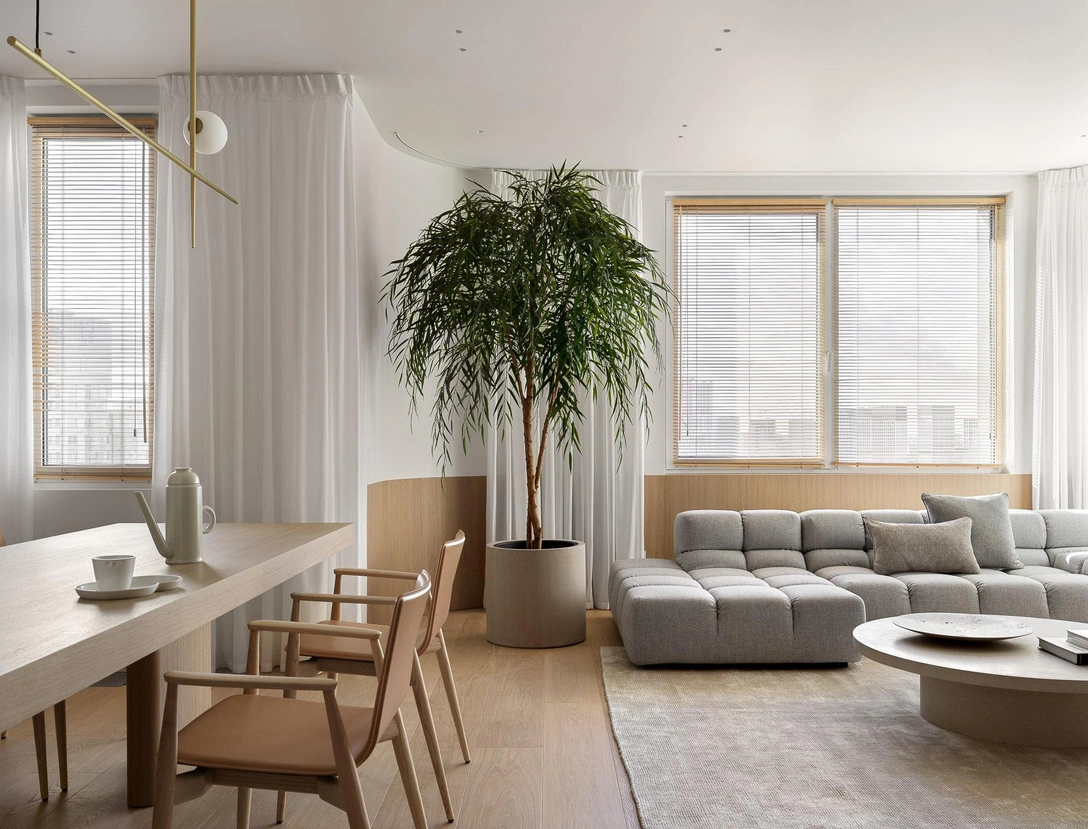 «Одна из особенностей изначальной архитектуры пространства — несущий пилон, расположенный в центре квартиры, прямо перед входом. Мы решили встроить в него обеденный стол. Вместе с этим появился главный мотив интерьера: округлые деревянные панели, которые „обнимают“ стены».
