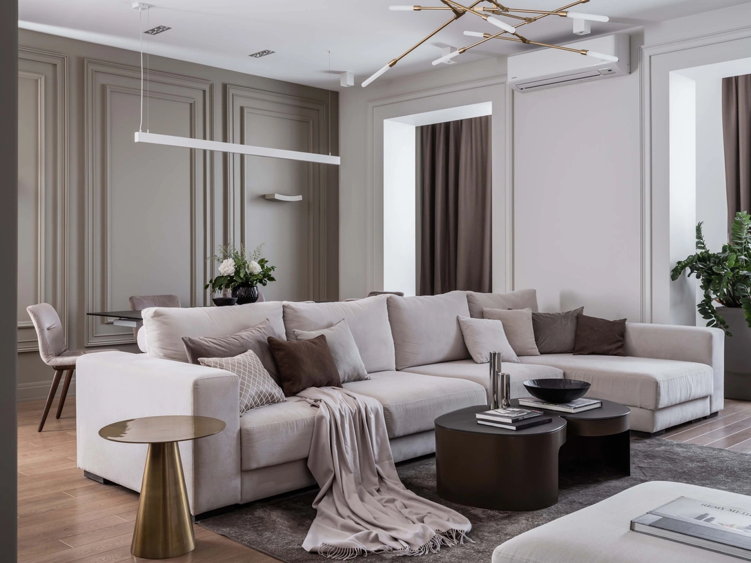 Отправной точкой стала исходная планировка от застройщика. В ходе работы над проектом основные зоны остались на прежних местах, при этом кухня и гостиная объединились. За основу была взята идея простых и лаконичных форм, использованы классические акценты в виде молдингов и карнизов. Дизайнер выбрала сдержанную цветовую гамму, которая сочетается с латунными деталями светильников и предметов декора. В каждой комнате прослеживается использование классических элементов, из-за чего пространство воспринимается цельным. Декор подбирался максимально деликатно. Его задача — не перетягивать внимание на себя, а стать лишь дополнением интерьера.