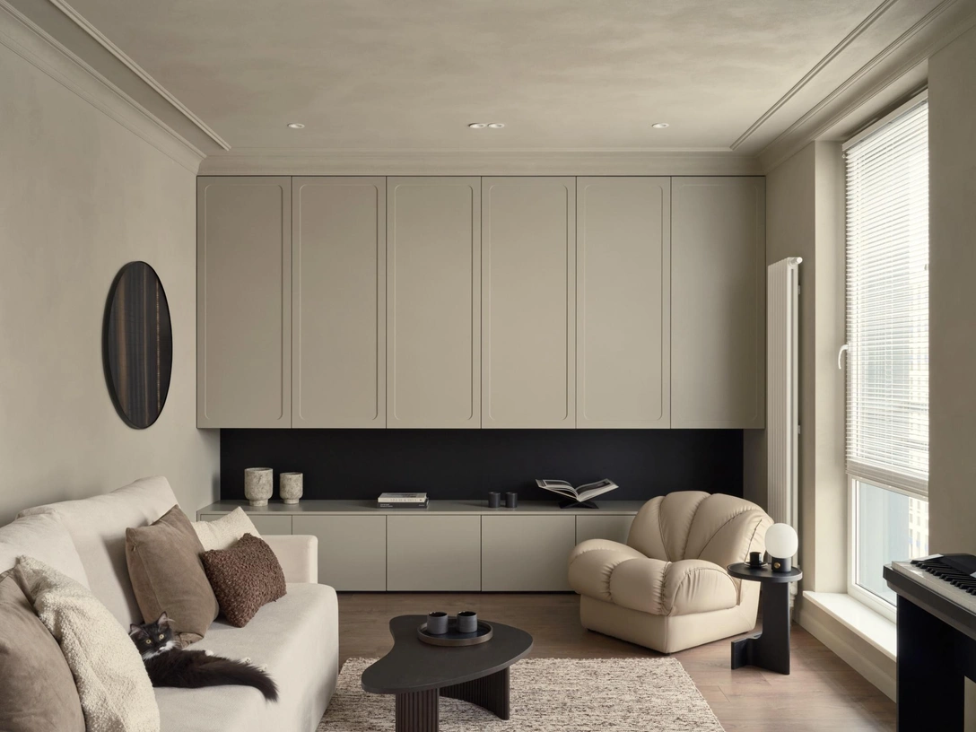 «Впервые взглянув на план квартиры, мы обратили внимание на вытянутую форму кухни и жилых комнат. Гостиная и спальня имели соотношение сторон, близкое к 2:1. Мы решили обернуть эту особенность планировки в свою пользу, разместив вдоль стен встроенные шкафы. Так нам удалось и хранение организовать, и придать помещениями более правильные пропорции».