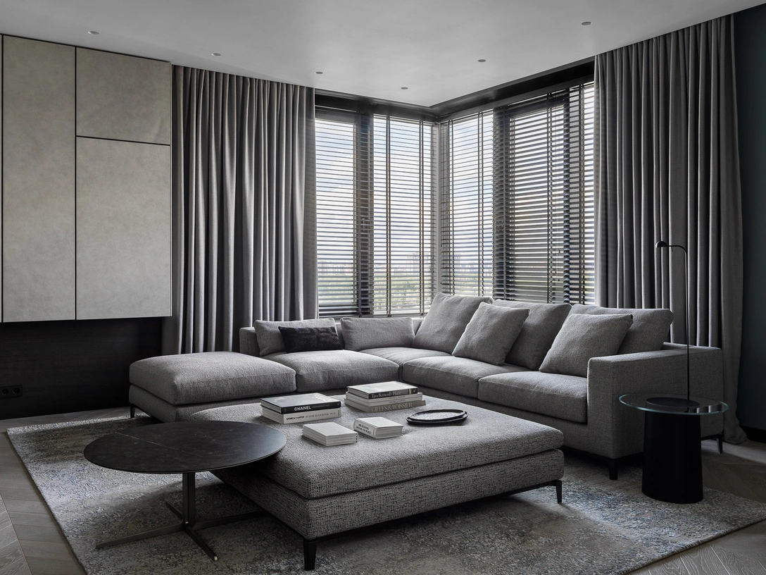Интерьер в целом получился очень графичным. Тонкие линии проходят по стенам, системам хранения, через колонны открытых стеллажей, ламели жалюзи и по «елочному» орнаменту паркетного пола. В это будто расчерченное по линейке пространство органично вписались округлые формы мебели, шарообразные светильники и мягкие объемы кресел. Легкости интерьеру также придает светло-серая палитра, разбавленная теплыми шоколадными, мятными и графитовыми акцентам.