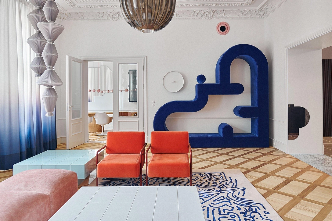 «В интерьерах я использовала дорогие, изысканные материалы, но отнеслась к ним со своего рода дистанцией и юмором. Это ироничное отношение разделяют и владельцы квартиры, они не побоялись необычных идей и побуждали меня искать новые формы», — рассказывает Катажина. Например, она придумала для комнат ассиметричные дизайнерские зеркала, благодаря которым интерьеры заиграли в новом свете: в них эффектно отражается яркая мебель и шторы с эффектом омбре, названные дизайнером «Синестезия» (в честь феномена, когда люди ассоциируют цвета с цифрами и буквами).