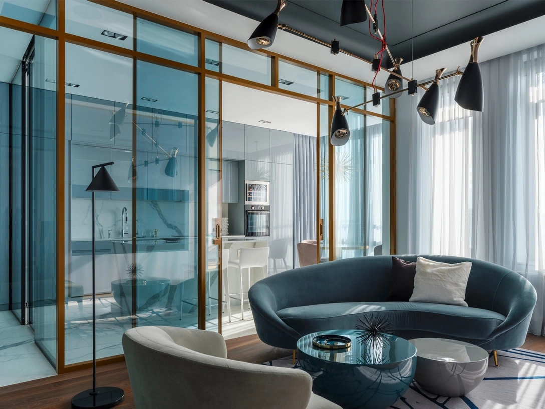 Стеклянная перегородка, отделяющая кухню от гостиной, делает помещение многомерным