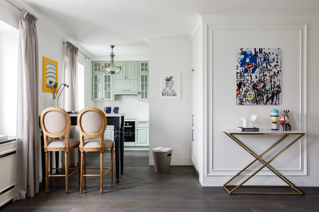 «Хозяйка квартиры — стильная молодая женщина, отдает предпочтение классическому стилю. Но так как квартира небольшая, интерьер хотелось сделать легким, воздушным, при этом эргономичным и не лишенным яркости», — рассказывает дизайнер Светлана Шалдыбина.