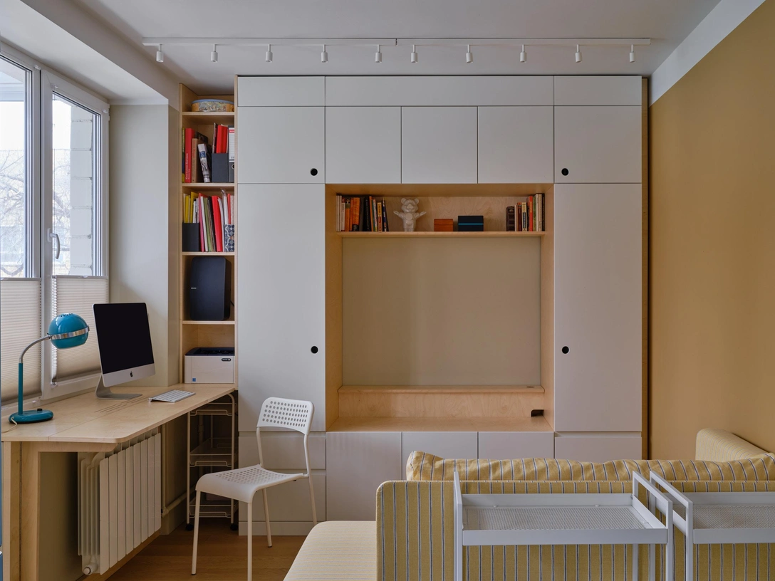 Самое важное в этом интерьере — мебель из фанеры, прочная, компактная и функциональная. Обычно я продумываю весь конструктив сама, но мне очень важно, чтобы у подрядчика был профессиональный конструктор, способный доработать чертежи и адаптировать их к производственным возможностям, чтобы монтаж происходил быстро, легко и без неприятных сюрпризов. И тут мне очень повезло со столярным производством, специализирующемся именно на мебели и конструкциях из фанеры. За двадцать с лишним лет моего дизайнерского опыта это была самая слаженная и четкая работа с производством.
