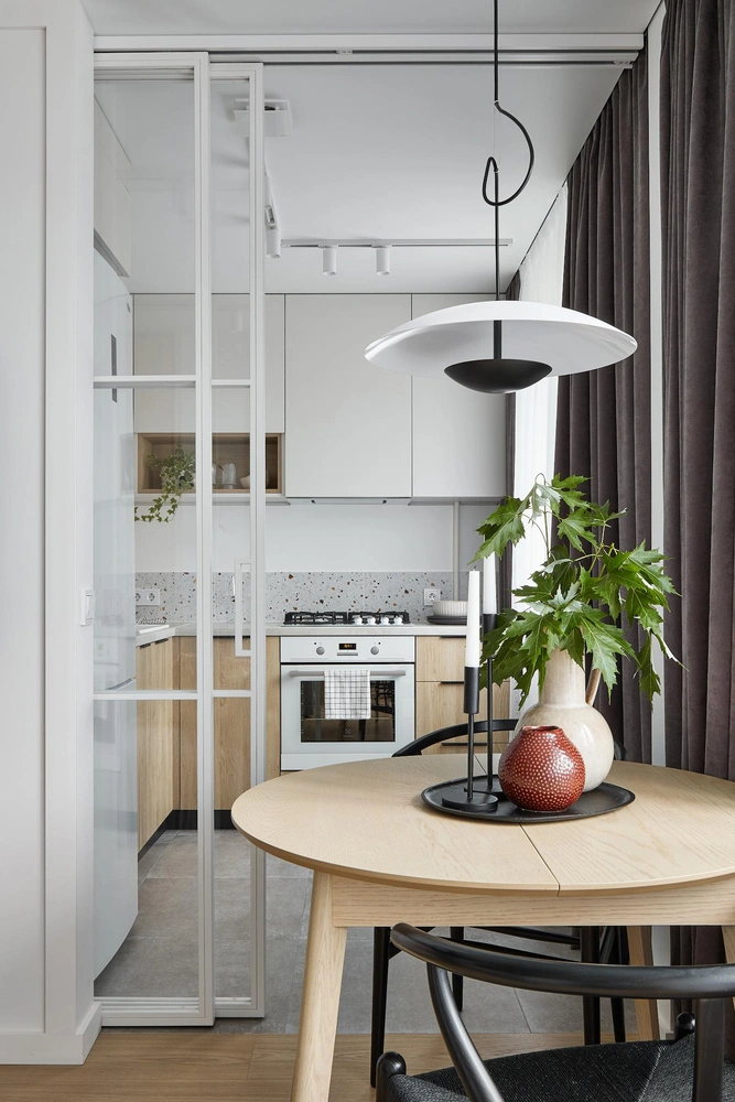Квартира представляла собой типовую «двушку» площадью 42 кв. м. Мы сделали полную перепланировку. Вход в кухню перенесли в гостиную, разграничив пространство стеклянной перегородкой. На месте небольшого коридора, ведущего на кухню, сделали двойную нишу: со стороны кухни в ней размещается холодильник, со стороны прихожей — хозблок со стиральной и сушильной машинами. Спальню увеличили и перенесли в нее вход в кладовую, из которой удалось сделать полноценную гардеробную.