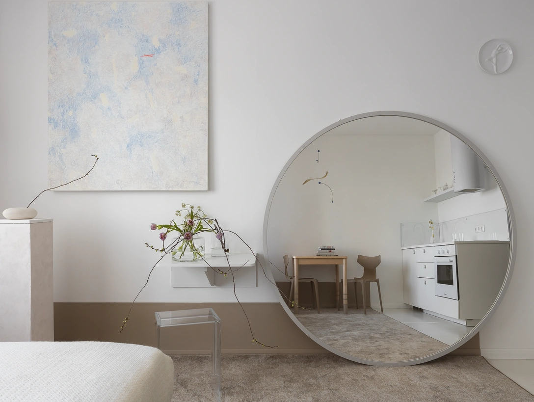 Еще одним важным элементом интерьера стало напольное зеркало. Благодаря ему комната кажется больше, а также оно отражает свет и наполняет им все пространство.