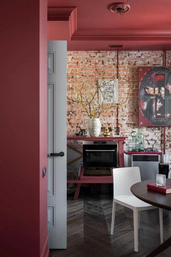 Чтобы показать истинный характер здания, в кухне мы открыли оригинальную кирпичную кладку. В гостиной оставили бетонную балку перекрытия, а в санузлах сбили старую плитку и получившуюся фактуру покрыли защитным лаком. Также я подобрала потолочный лепной плинтус максимально похожий на оригинальный — простой, лаконичный, без нагромождения деталей, и не стала менять радиаторы отопления на более современные. Почти во всех помещениях мы выкрасили потолки в цвет стен, только в спальне использовали сочетание насыщенного терракотового и теплого зеленого.