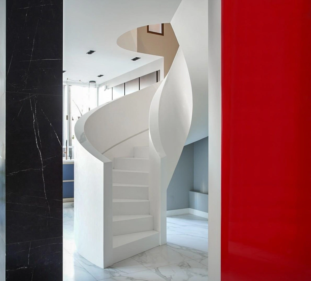 Нужно было разместить лестницу, ведущую на второй этаж, так, чтобы по ней было комфортно подниматься. Ее отлили из бетона по моим чертежам, ограждения покрыли венецианской штукатуркой, а ступени отделали искусственным белым камнем — если смотреть с верхнего этажа, она похожа на морскую ракушку в разрезе.