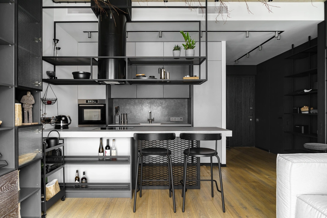 «Мы благодарны заказчице за то, что она не испугалась брутальных поверхностей, темных оттенков и обилия металла и сохранила нашу идею в процессе реализации, — говорят авторы проекта. — Ее доверие помогло нам в полной мере использовать декоративные приемы стиля лофт, что вылилось в интересный, а главное, удобный для жизни интерьер».