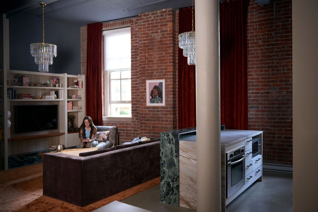Кирпич и натуральный камень — материалы, характерные для лофтовой стилистики, — соседствуют здесь с роскошным мрамором разных пород и благородным ореховым деревом. Тепла и уюта интерьеру добавляет авторский текстиль. Большинство мебели сделано на заказ. Джасмит любит работать в разных уголках своего дома, поэтому дизайнеры предусмотрели для нее много разных рабочих мест, которые можно встретить и в зоне столовой, и в спальне. Получился уютный интерьер, который идеально подходит к стилю жизни и характеру хозяйки дома.