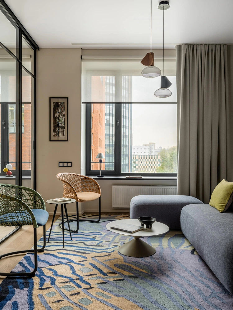 «Интерьер вдохновлен дизайном группы „Мемфис“ и исполнен в современной трактовке, впитавшей в себя все самое интересное из последующих интерьерных течений и стилей. Так как пространство небольшое, мы продумывали каждый ракурс. Из центральной точки гостиной просматривается и спальня, и прихожая, поэтому важно было выдержать баланс цвета и объема между зонами.