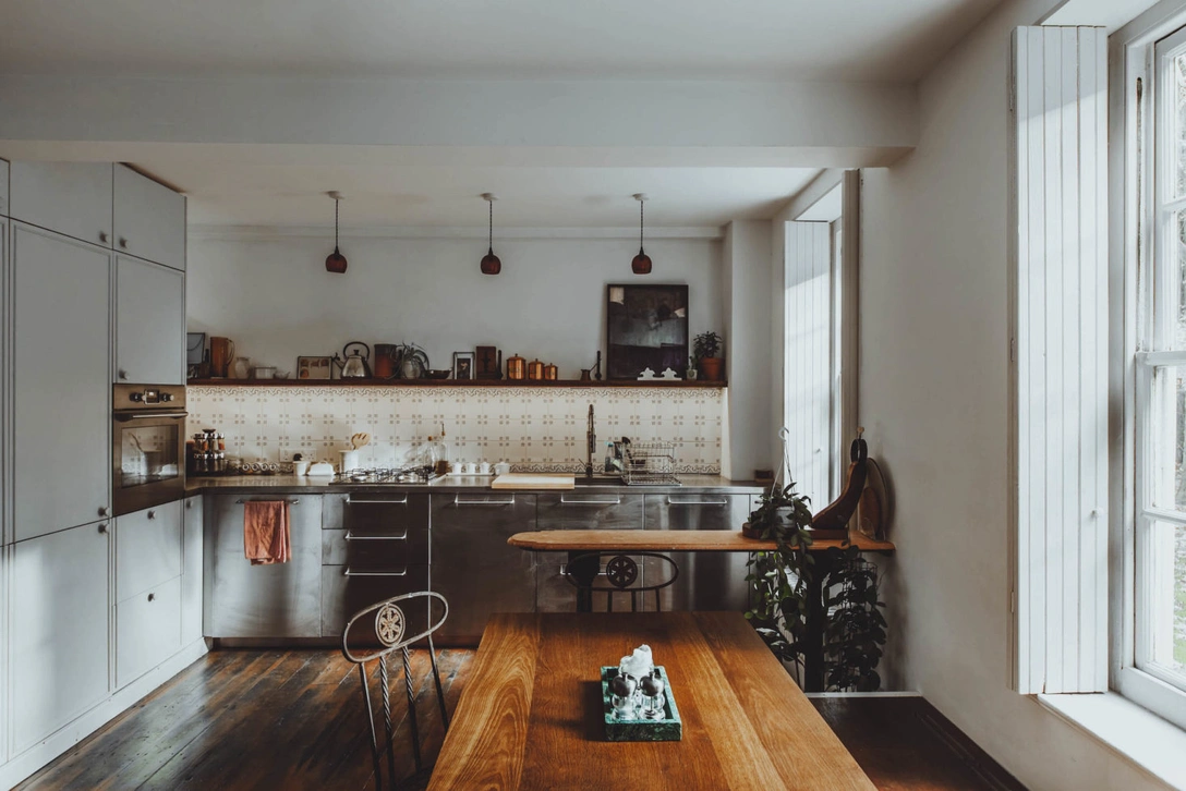 Исполнить детскую мечту Лайонела о кухне, похожей на профессиональную, помогла, как это ни странно, ИКЕА. Именно там пара нашла мебель с фасадами из нержавеющей стали и дополнила ее выполненной на заказ столешницей из такого же материала. Тем не менее, интерьер не кажется холодным благодаря сбалансированному сочетанию металла, темного дерева, белого оттенка стен и традиционной плитки азулежу, украшающей фартук.