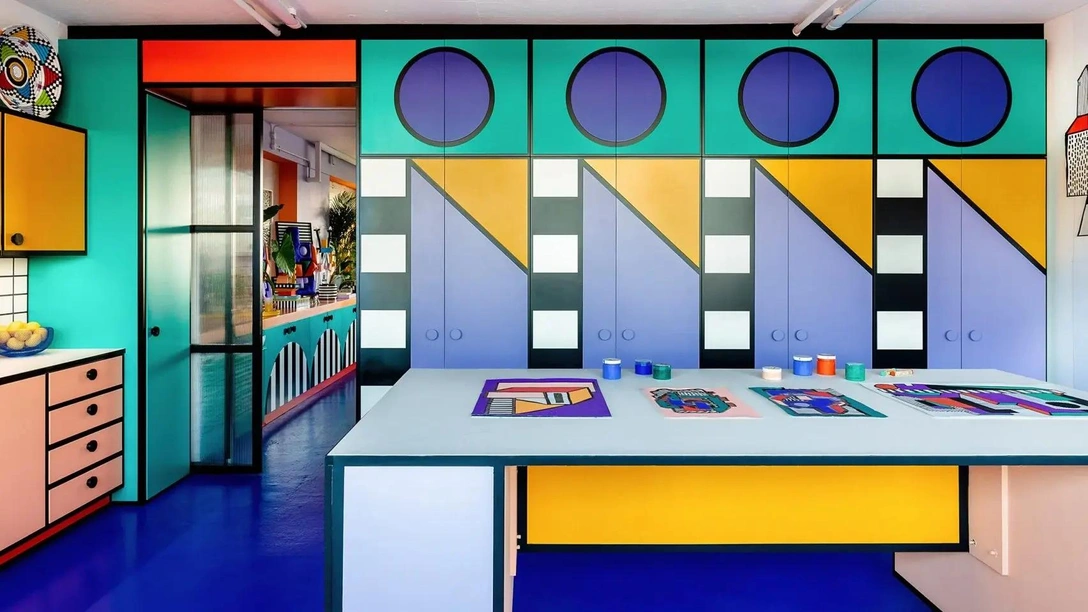 Студию, которая расположена в здании Regent Studios рядом с Бродвейским рынком в Восточном Лондоне, она превратила в свою визитную карточку. Приступая к созданию, Камилла Валала и креативный директор ее студии Джулия Джумаа испытывали некоторые сомнения: стоит ли и здесь использовать смелую цветовую палитру? Желание вдохновляться своим рабочим пространством победило, и в студии появились ярко-голубые полы, шкафы с графическим рисунком и мини-кухня с мультяшными пропорциями — совсем как в проекте The House of Dots.
