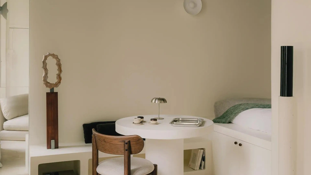Из студии открывается вид на ухоженный садик во дворе. Вдохновленный этим видом архитектор придал интерьерам очарование средиземноморских домов: «Деревянные балки, каменный пол, скругленные углы и оттенки белого придают квартире вневременное ощущение. Я спроектировал ее так, чтобы пространство ощущалось как тихая гавань, островок безмятежности и спокойствия в шумном Париже».