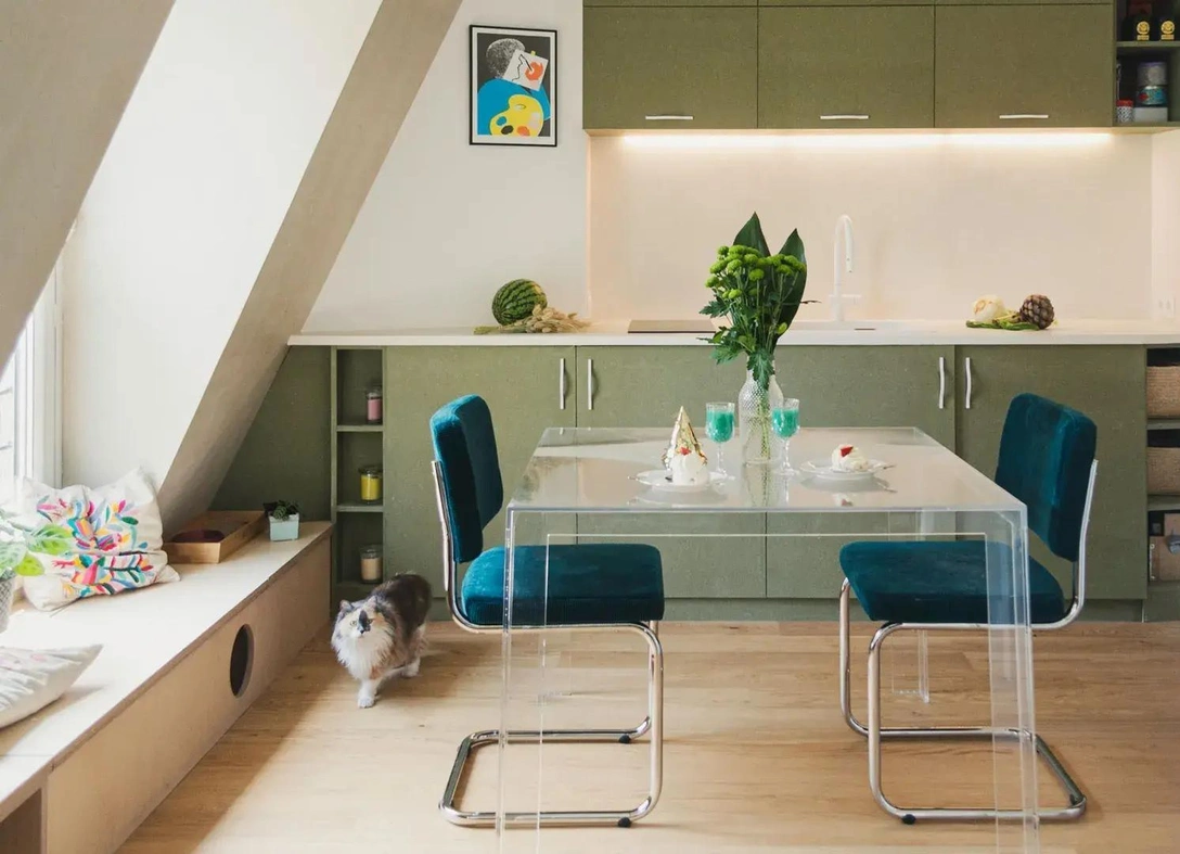 В маленькой квартире удобнее использовать нестандартную мебель, считает дизайнер. Так вдоль стены установили многофункциональную скамью, которая подходит для разных жизненных сценариев. Она может служить и тумбочкой, и местом для отдыха, и дополнительным сиденьем в столовой, и даже домиком для кошки.
