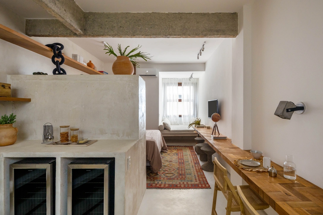 Владелица маленькой квартиры площадью всего 27 м2 в Ипанеме (один из южных районов Рио-де-Жанейро рядом со знаменитым пляжем) — любит путешествовать. Она живет в Сан-Паулу, но из-за частых разъездов ей нужна была база в Рио — пусть и небольшого размера. Остановив свой выбор на этой микро-квартире, хозяйка обратилась к архитекторам Мариане Тейшейре (Mariana Teixeira) и Педро Пантохе (Pedro Pantoja) из бюро Bric Arquitetura и заказала ее полную переделку. «Заказчице хотелось создать интерьер, который отсылал бы к домам на Санторини», — рассказывают дизайнеры.