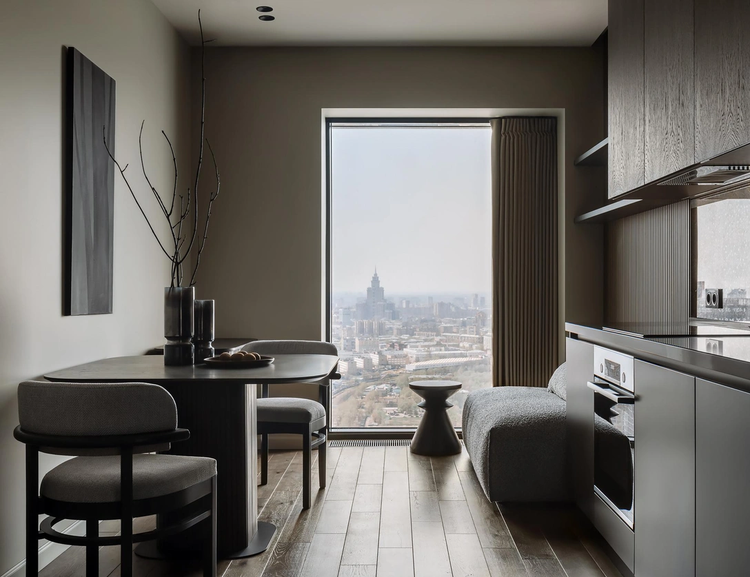 «Панорамные окна и вид на Москву с 50-го этажа определили основную идею этого проекта, — рассказывает дизайнер Юлия Баршевская. — Хотелось поддержать панораму города и за счет натуральных материалов, красивых фактур и спокойных природных оттенков создать оазис спокойствия и умиротворения».