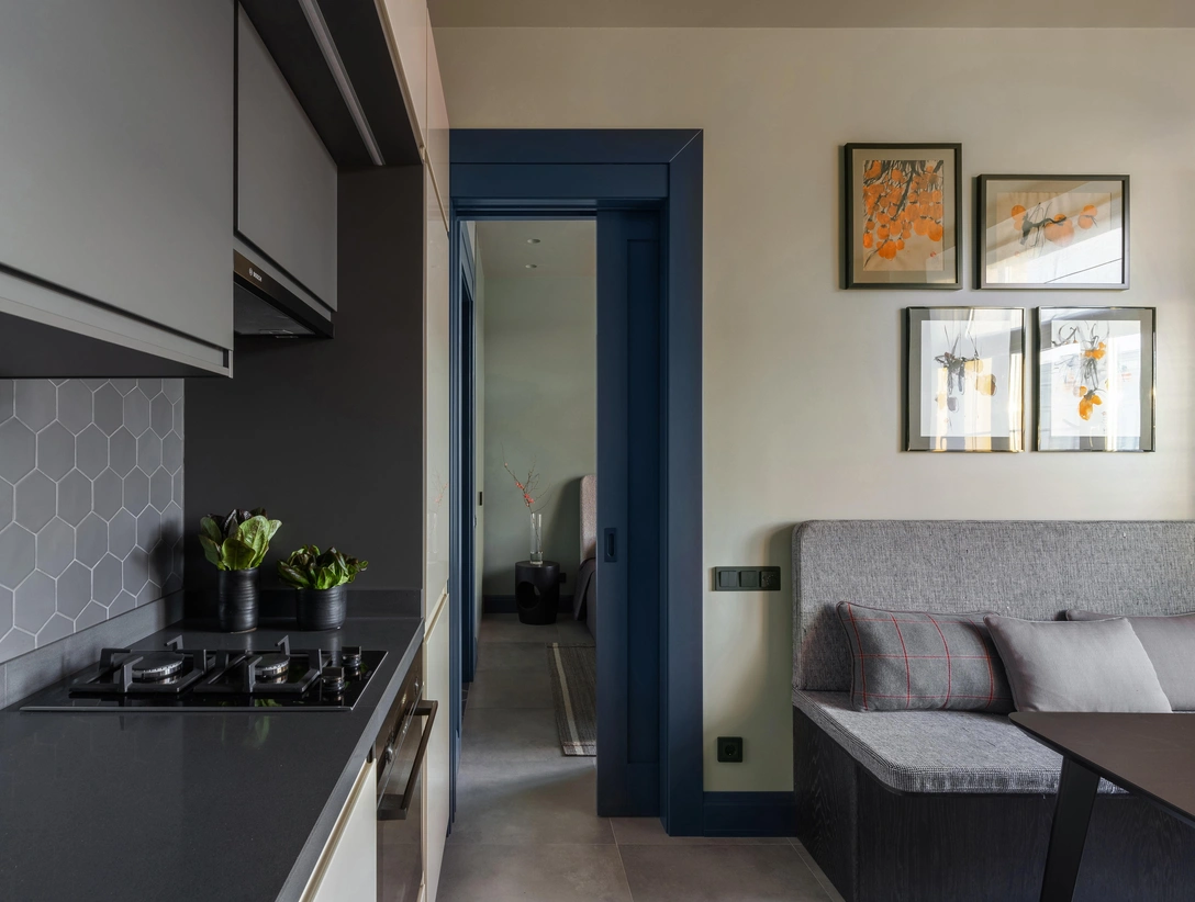 «Площадь квартиры небольшая — всего 36 кв. метра. Несущие конструкции по потолку и положение технических точек — водопроводных и газовых стояков — не позволяли провести кардинальную планировку. Поэтому пришлось пойти на компромисс: сделать проход на кухню-гостиную через спальню. Раздвижные двери и встроенная мебель помогли разграничить функциональные зоны и сохранить максимум свободного места.