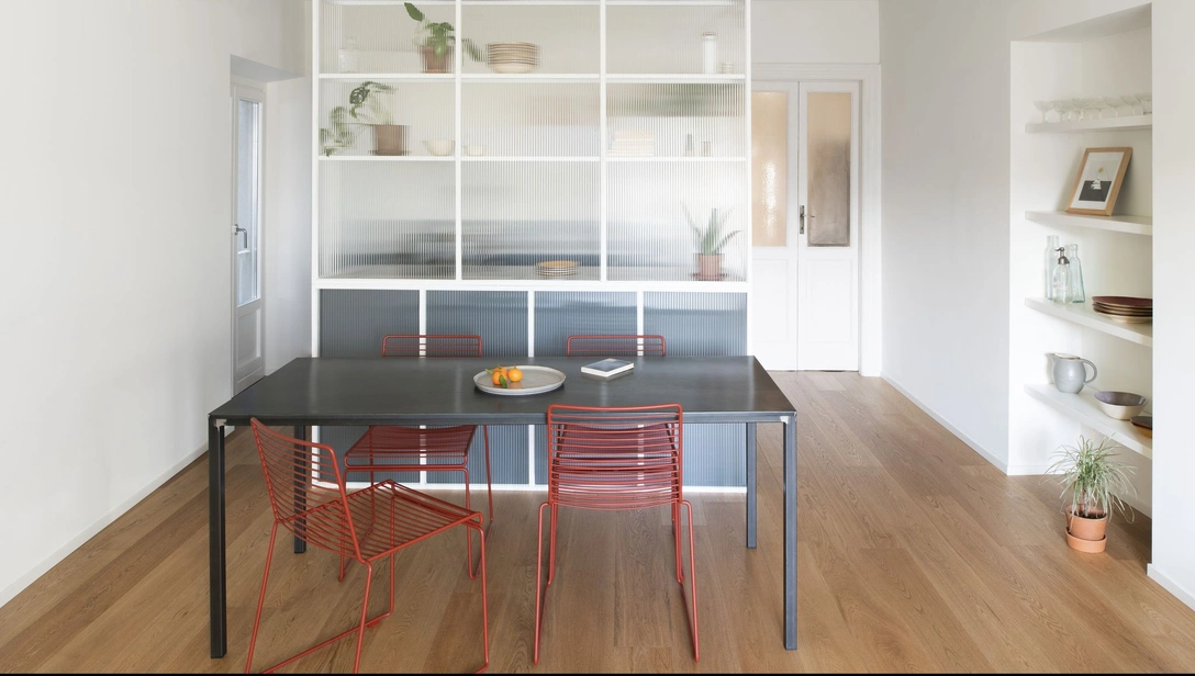 Современную минималистичность белого пространства разбавляют традиционные детали, благодаря которым оно не выглядит слишком холодным, сдержанным и стерильным. Это, например, цветная цементная плитка на полу во входной зоне и в ванной комнате — оммаж плиточным полам в старых миланских домах. Она служит ярким акцентом на фоне деревянной паркетной доски, используемой для отделки полов в остальных помещениях дома.