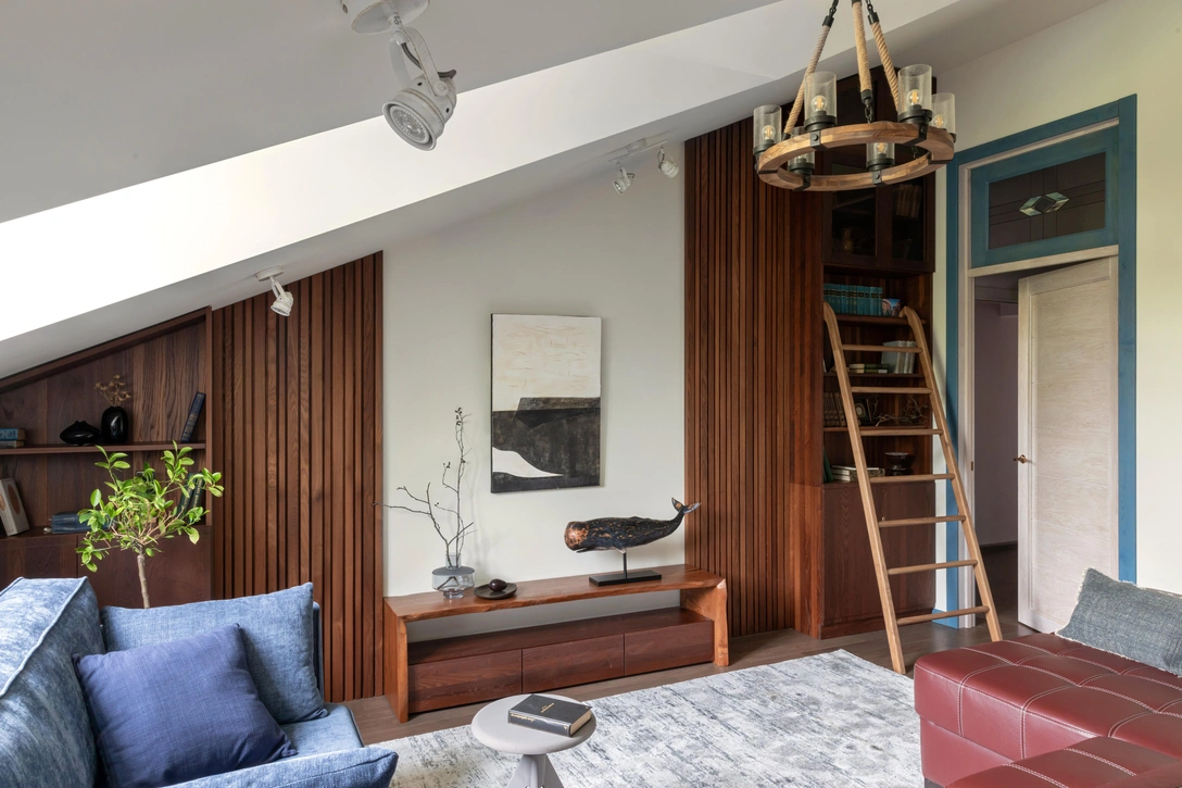 Заказчики долгое время жили в Великобритании, их вкусы и привычки сформировались на британской земле, и свою квартиру в России они хотели видеть похожей на привычные им лондонские квартиры. Дизайнера они просили использовать в интерьере как можно больше натурального дерева, поэтому большая часть гостиной обшита ароматным термоясенем, который сглаживает углы мансарды и создает в комнате теплую, уютную атмосферу. Натуральное дерево используется и в других комнатах, например, в детской, где из него сделан стол, стеллаж и чердачная кровать.